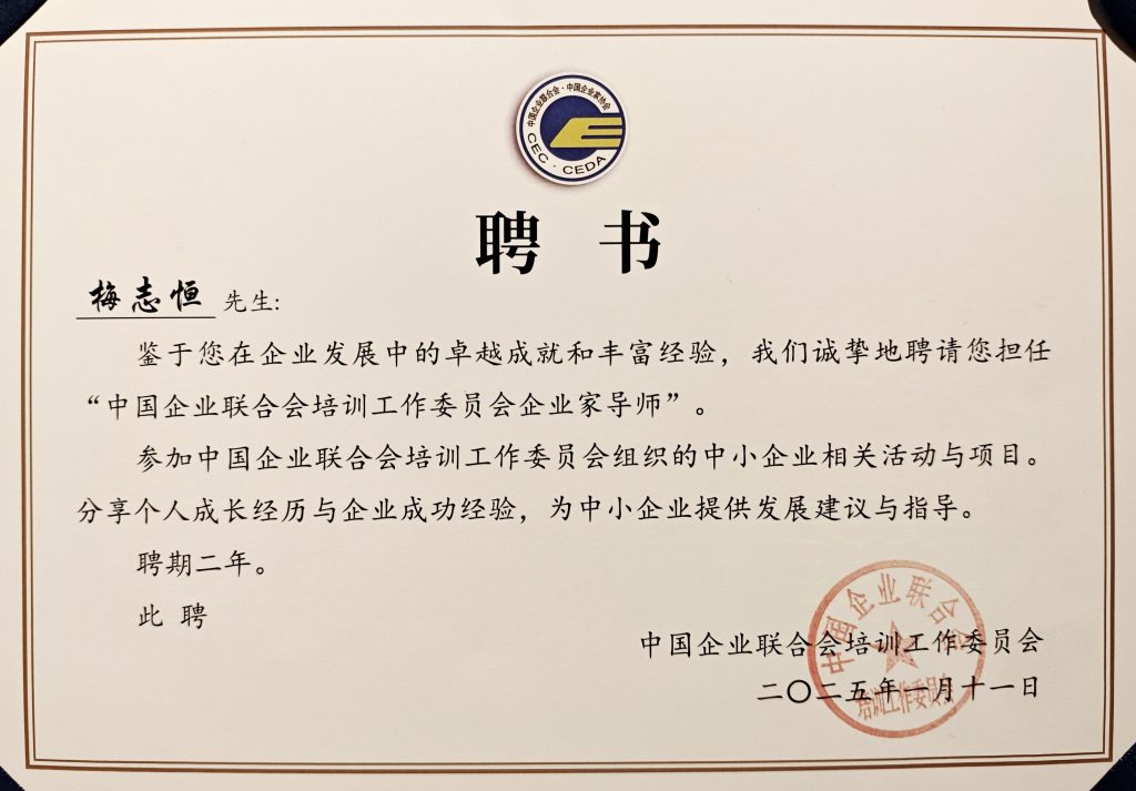节目直播结束后,董事长梅志恒被中国企业联合会培训委员会聘为“企业家导师”,未来将在更多的平台上与大家分享管理理念和经营心得。