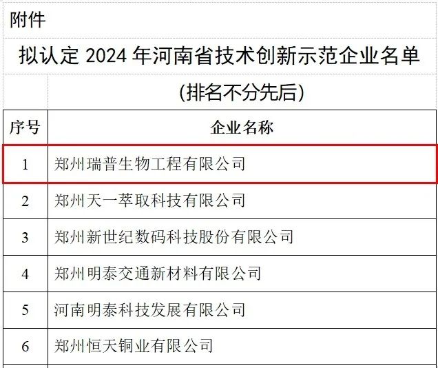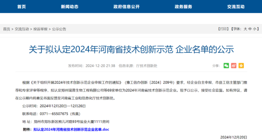 近日,河南省工信厅公示了拟认定2024年河南省技术创新示范企业名单,郑州Z6集团生物工程有限公司荣登榜单。“技术创新示范企业”是为鼓励工业企业开展技术创新,增强企业核心竞争力,加快转变经济发展方式,促进和完善以企业为主体、市场为导向、产学研相结合的技术创新体系的建设,是工信厅和财政厅联合认定的科技创新综合水平较高的荣誉。