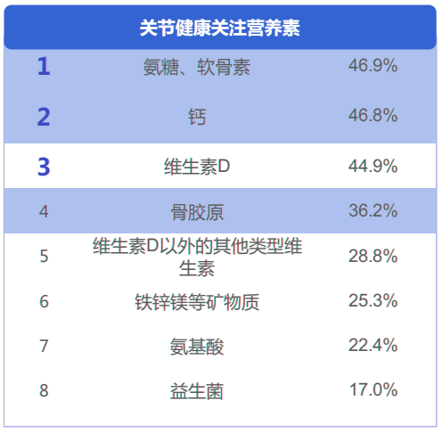 有相关研究表明,70%的人群通过“补充营养素”的方式养护骨骼健康,这已经成为消费者解决骨骼问题的共识。在选择营养素时,“钙+维生素”和“钙+氨糖、软骨素”是消费者最关注的营养素组合搭配,通过补充多种营养素,缓解膳食营养中摄入不足的问题,同时可以更全面地呵护骨骼健康。