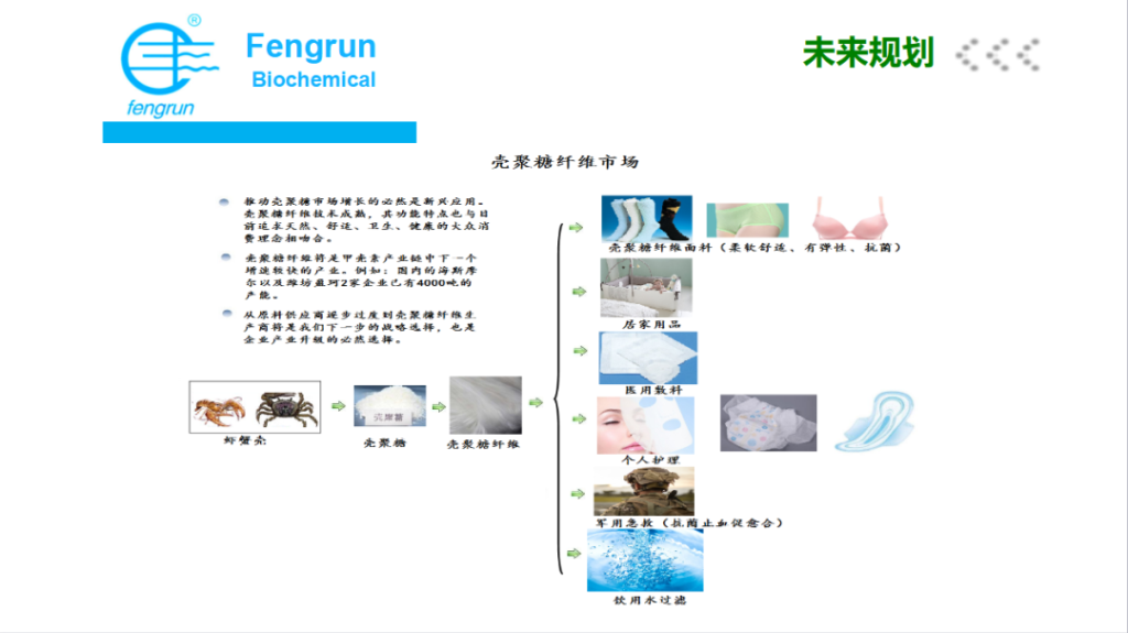 目前,国内的甲壳质产品已由单一品种(工业用壳聚糖)向多品种发展,已经工业化生产的产品主要有两大类近20种产品,一类是甲壳质的水解产物及其延伸产品,如氨糖系列产品,主产品包括氨基葡萄糖盐酸盐、氨基葡萄糖硫酸盐、N-乙酰氨基葡萄糖等,另一类是壳聚糖系列产品,如工业及医药行业用壳聚糖、高分子壳聚糖及高密度壳聚糖等。以上产品均可作为某些最终产品的原料或是中间体,主要用于医药保健、功能食品、化工、污水净化、农业植保等,除此以外,近年来还开发了一些科技含量较高的产品,如壳聚糖纤维面料、壳聚糖医用敷料、人体神经导管等。