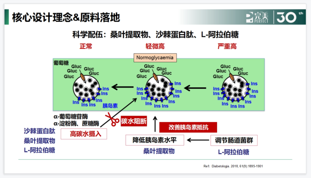 基于以上机制,在沙棘蛋白肽的研究基础上进一步探究,发现桑叶提取物、沙棘蛋白肽、L-阿拉伯糖这几个原料组合,能够通过抑制糖吸收、调节胰岛、调节肠道菌群等多维度发挥调控血糖的作用。