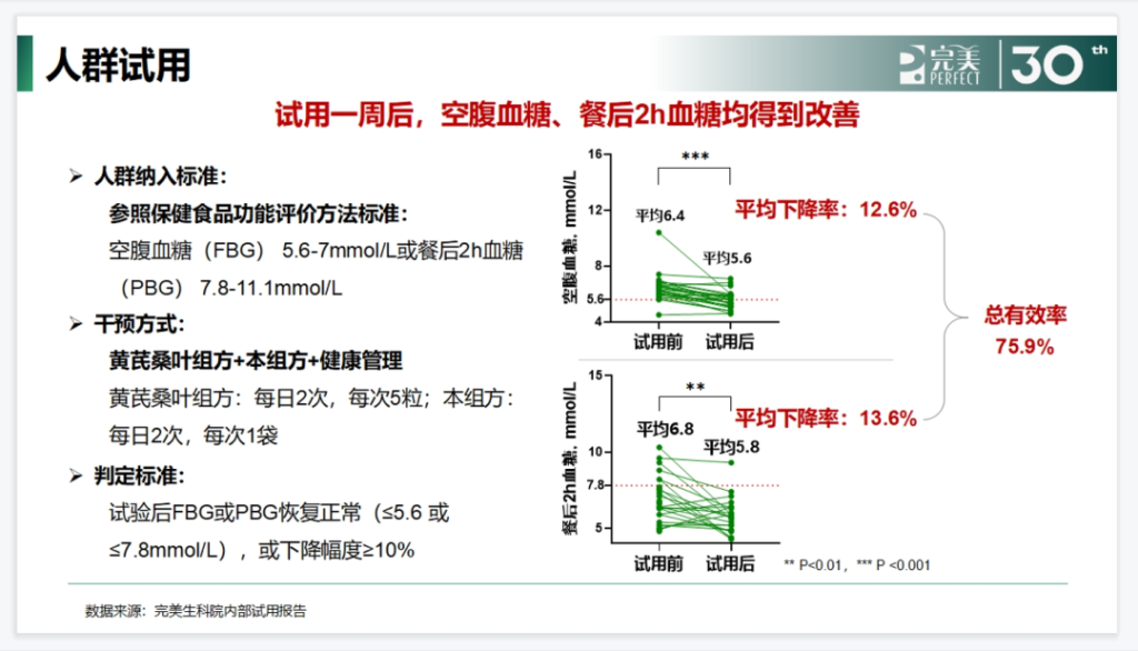 同时进行相关的人体试验,对降低受试食物餐后血糖应答作用效果研究,结果表明,试用组方一周后,空腹血糖和餐后2h血糖均得到了改善,血糖水平相较于没有试用组方的下降幅度≥10%左右。