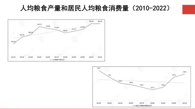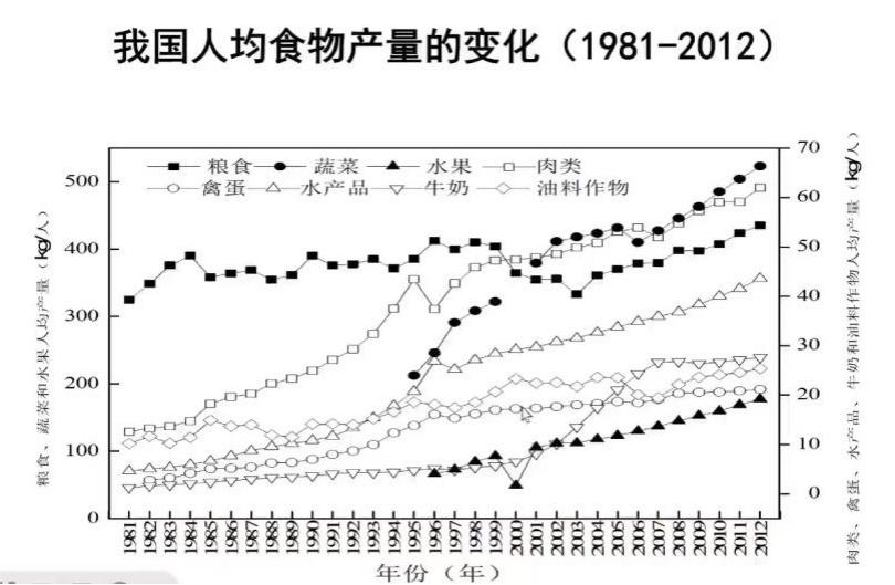 从1980年到2012年的30年当中,中国整个食物的产量包括粮食、蔬菜水果等增长幅度是非常大的,另外包括肉类、禽蛋、水产品、牛奶、油料作物等都在不断的攀升。我们国家人均的粮食产量大概483公斤,人均的粮食消费量是144.6公斤,另外还有其他的一些粮食,会用于饲料和其他的食品加工业。