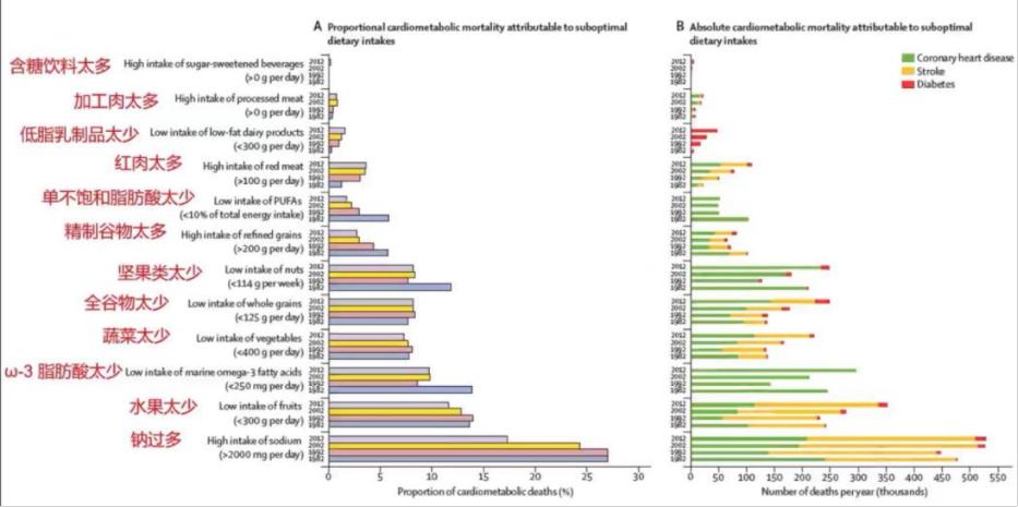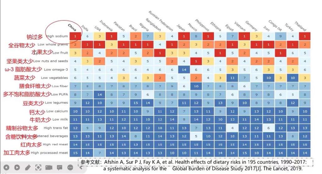 丁钢强所长团队发表在柳叶刀子刊上的一篇文章表明,以心血管疾病的死亡作为我们中国人膳食影响因素的一个终局来看,我国居民的钠摄入过多,水果、ω-3脂肪酸、蔬菜、全谷物太少是其中非常重要的原因。