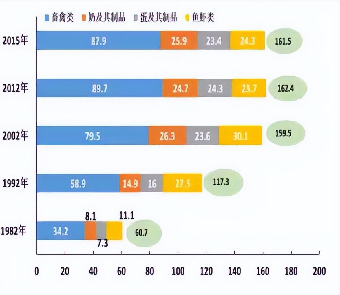 动物性食物在快速的上升,摄入量消费量也是在快速上升。每人每天从82年总的动物性食物的量只有60克,到现在上升到160克以上,而且增加的主要是畜禽肉类。奶类有所增加,但全国平均增加的幅度并不大,所以需要进一步的推动。另外水产品也有所上升,但近几年平均消费量并没有上升。