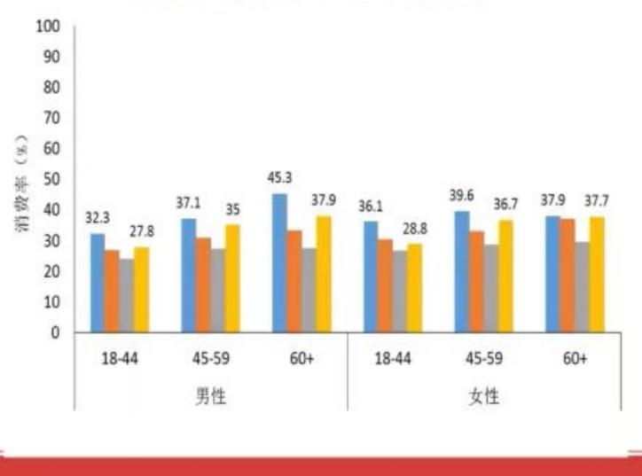 我国不同地区不同年龄人群,粗杂粮的消费率现在都处在比较低的水平,包括男性和女性。相对来说,60岁以上老年人的粗杂粮消费比例相对要比年轻人要高一些,但总体消费水平都比较低。