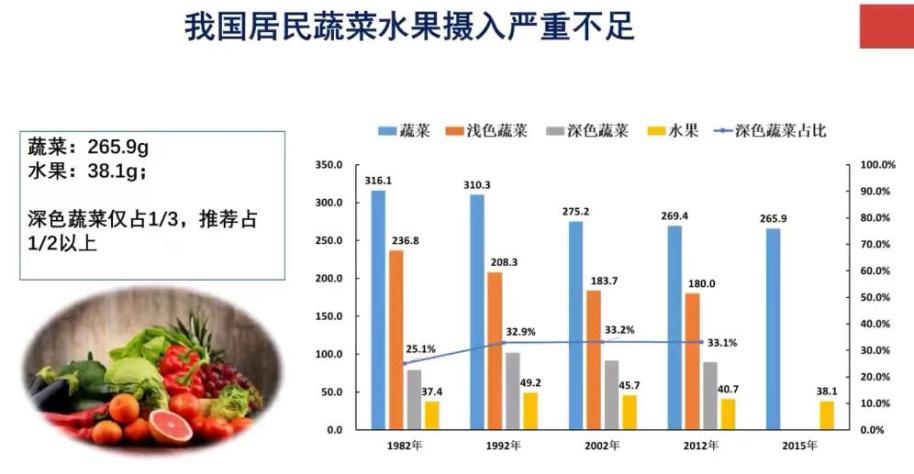 我国居民的蔬菜和水果摄入量是严重不足的,尽管我国家与其他国比,蔬菜摄入量是较多的,但是跟居民膳食指南来比是远远不够的。