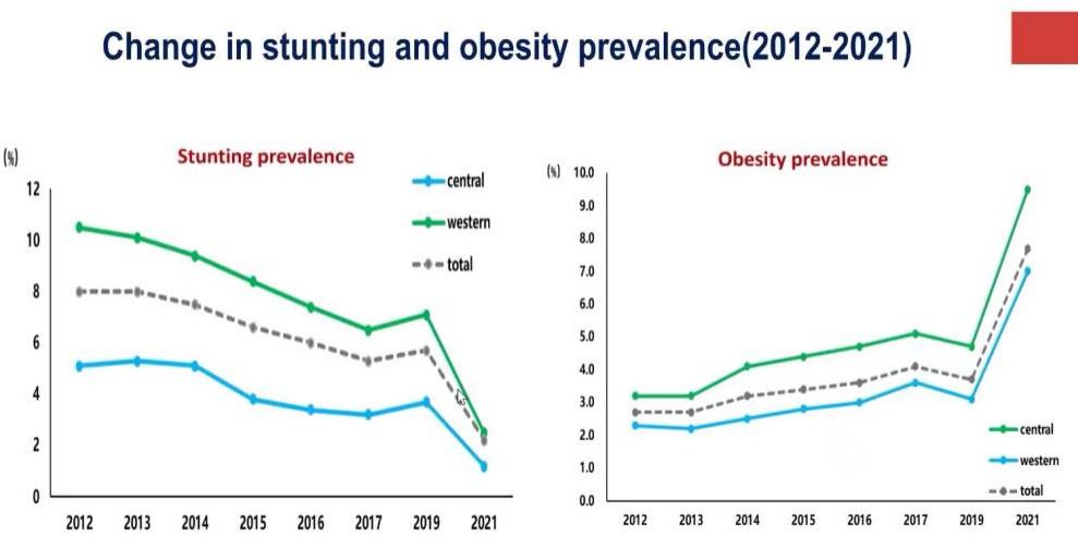 从营养健康所监测的数据可以看到,我国居民整体营养状况和体格在不断地改善,原来生长迟缓率比较高和新生儿低体重率比较高的情况,现在都降到了比较低的水平。