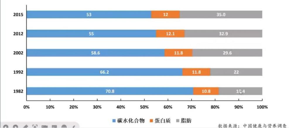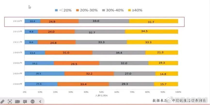 在我们碳水化合物占功能比逐步减少的同时,脂肪的功能比从1982年只有18.4%的低水平,已经上升到了35%。丁钢强所长谈到脂肪功能比在20%-30%是比较健康的,而现在全国平均已经远超30%。而且超过30%脂肪功能比的人数达到了64.7%,还有31.7%人群的脂肪功能比超过了40%。