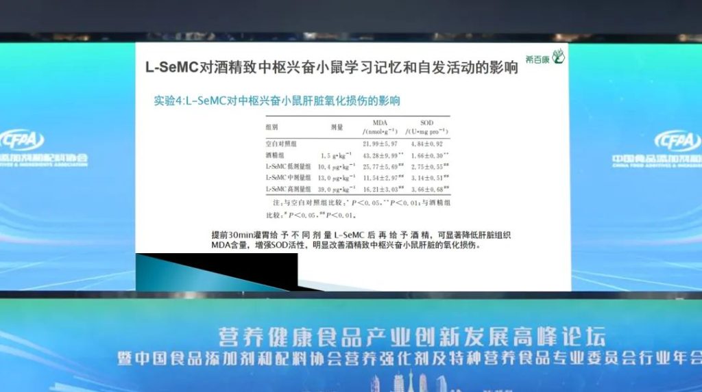 研究数据表明,L-SeMC作为一种新的硒供体,在一定的剂量范围内可改善酒精致中枢兴奋对学习记忆功能的降低,抑制中枢兴奋自发活动,其机制可能与改善酒精致中枢兴奋小鼠的肝功能和肝脏氧化损伤有关,这为L-SeMC的应用和推广提供了新的参考依据。