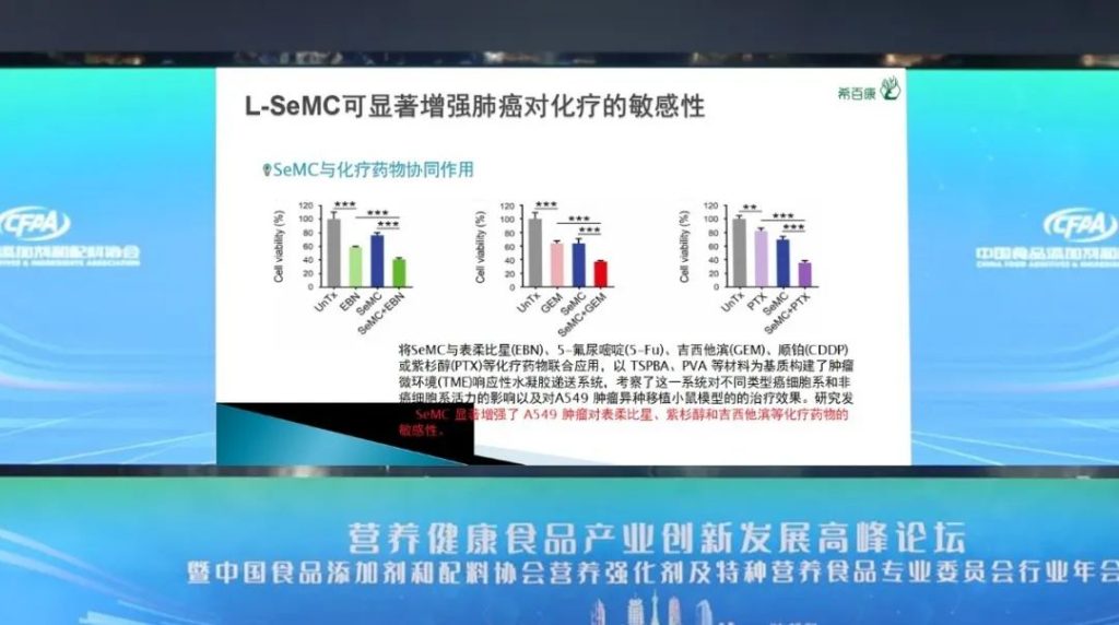 研究数据表明,L-硒-甲基硒代半胱氨酸可显著增强肺癌对化疗的敏感性,其与化疗药物的联合应用可减少癌症治疗所需的药物剂量,降低甚至避免潜在的副作用,L-硒-甲基硒代半胱氨酸联合化疗药物的治疗策略在肿瘤治疗中具有巨大的潜力。