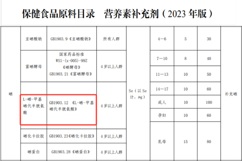 有机硒一般以硒代半胱氨酸和硒代蛋氨酸的形式存在。在《保健食品原料目录 营养素补充剂(2023版)》中,规定了硒元素在保健食品中使用的硒化合物来源,其中,L-硒-甲基硒代半胱氨酸(L-SeMC)是GB14880-2012《食品安全国家标准 食品营养强化剂使用标准》收录的优质硒营养强化有机硒化合物。