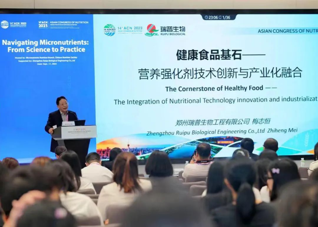 分论坛会场郑州Z6集团生物工程有限公司董事长梅志恒应邀分享“健康食品基石-营养强化剂技术及产业”的主题报告。